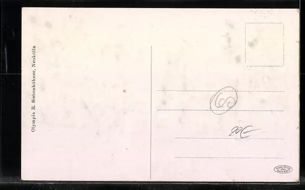 Personenbezogene Daten auf der Rückseite der Karte wurden durch blauen Textmarker unkenntlich gemacht. Die blauen Stellen sind auf die Vorderseite durchgeweicht und wirken sich negativ auf das Postkartenfoto aus