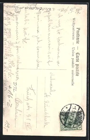Personenbezogene Daten auf der Rückseite der Karte wurden durch blauen Textmarker unkenntlich gemacht. Die blauen Stellen sind auf die Vorderseite durchgeweicht und wirken sich negativ auf das Postkartenfoto aus