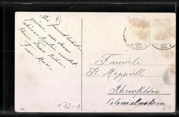 Personenbezogene Daten auf der Rückseite der Karte wurden durch blauen Textmarker unkenntlich gemacht. Die blauen Stellen sind auf die Vorderseite durchgeweicht und wirken sich negativ auf das Postkartenfoto aus