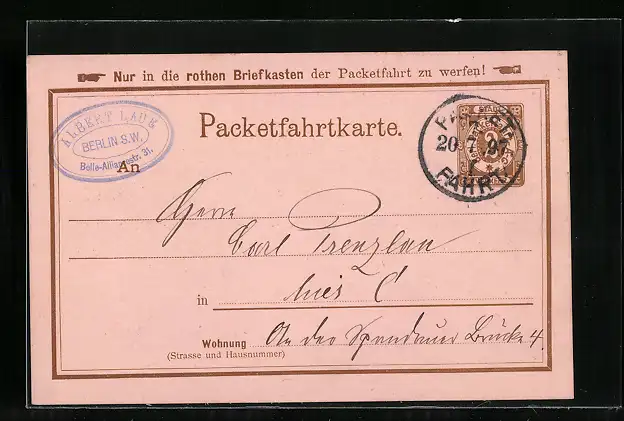 AK Berlin, Packetfahrtkarte, Private Stadtpost Berliner Packetfahrt AG