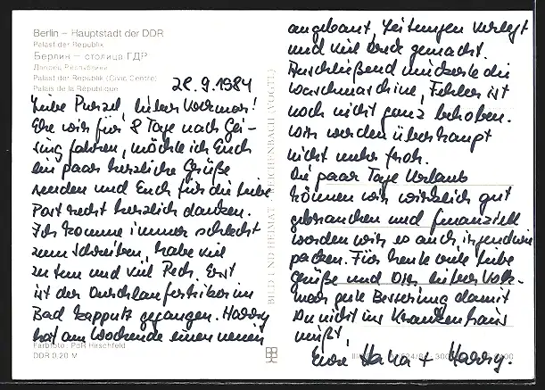 Personenbezogene Daten auf der Rückseite der Karte wurden durch blauen Textmarker unkenntlich gemacht. Die blauen Stellen sind auf die Vorderseite durchgeweicht und wirken sich negativ auf das Postkartenfoto aus