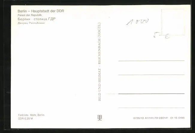 Personenbezogene Daten auf der Rückseite der Karte wurden durch blauen Textmarker unkenntlich gemacht. Die blauen Stellen sind auf die Vorderseite durchgeweicht und wirken sich negativ auf das Postkartenfoto aus