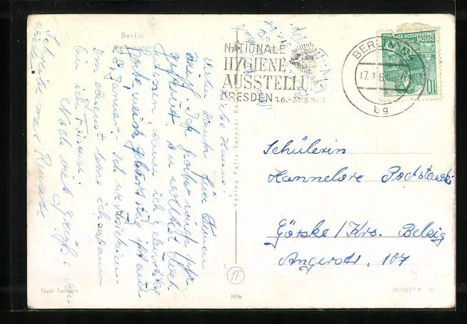 Personenbezogene Daten auf der Rückseite der Karte wurden durch blauen Textmarker unkenntlich gemacht. Die blauen Stellen sind auf die Vorderseite durchgeweicht und wirken sich negativ auf das Postkartenfoto aus