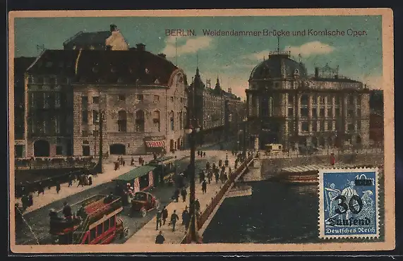 AK Berlin, Partie an der Weidendammer Brücke, Komische Oper, Bus, Strassenbahn, Dampfer