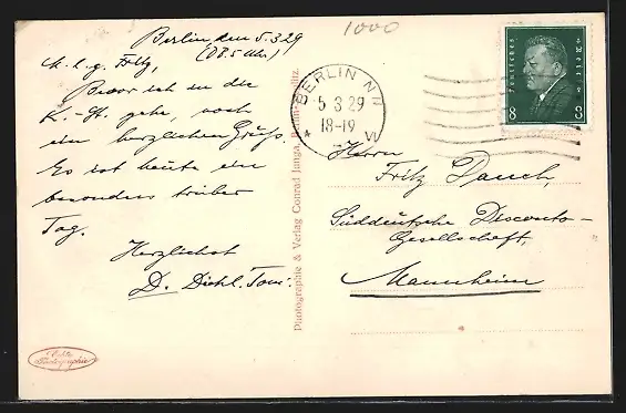alte Ansichtskarte, gelaufen 1929, Bugspur re. oben, Kleberest re., guter Zustand