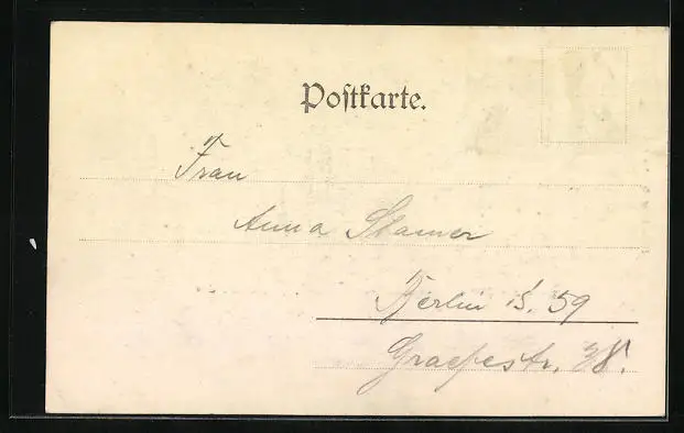 Personenbezogene Daten auf der Rückseite der Karte wurden durch blauen Textmarker unkenntlich gemacht. Die blauen Stellen sind auf die Vorderseite durchgeweicht und wirken sich negativ auf das Postkartenfoto aus