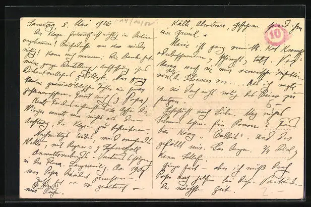 Personenbezogene Daten auf der Rückseite der Karte wurden durch blauen Textmarker unkenntlich gemacht. Die blauen Stellen sind auf die Vorderseite durchgeweicht und wirken sich negativ auf das Postkartenfoto aus