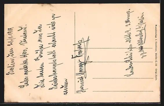 Personenbezogene Daten auf der Rückseite der Karte wurden durch blauen Textmarker unkenntlich gemacht. Die blauen Stellen sind auf die Vorderseite durchgeweicht und wirken sich negativ auf das Postkartenfoto aus