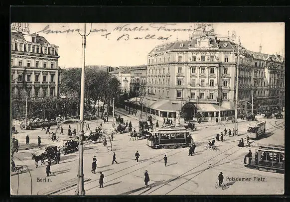 AK Berlin, Potsdamerplatz mit Strassenbahnen und Kutschen