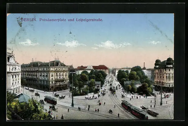 AK Berlin, Potsdamerplatz und Leipzigerstrasse mit Strassenbahnen