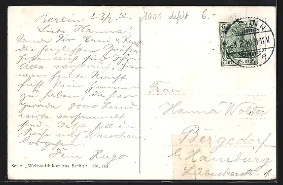 alte Ansichtskarte, gelaufen 1910, geklebter Einriss unten li., rückseitig Klebe- und Papierreste, Stempelspur, guter Zustand