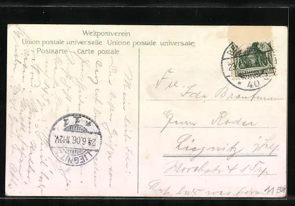 alte Ansichtskarte, gelaufen 1906, Briefmarke entfernt, rückseitig Oberflächenschaden, guter Zustand