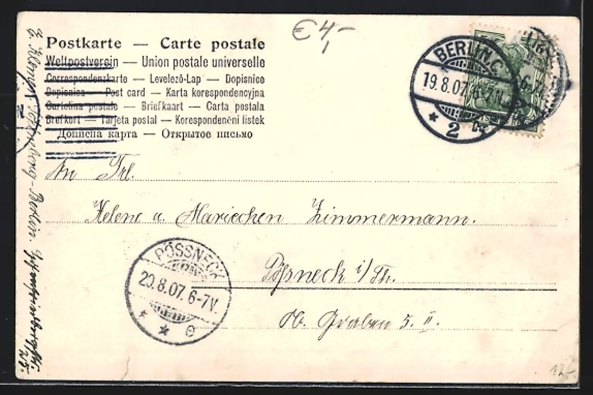 alte Ansichtskarte, gelaufen 1907, Eckknick unten li., kl. geklebter Einriss unten re., Stempelspur, guter Zustand