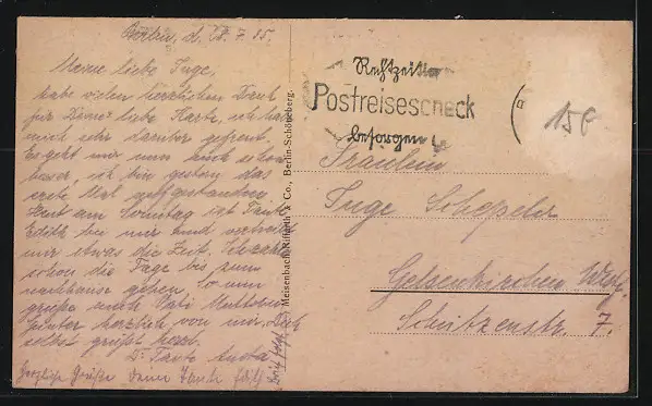 Personenbezogene Daten auf der Rückseite der Karte wurden durch blauen Textmarker unkenntlich gemacht. Die blauen Stellen sind auf die Vorderseite durchgeweicht und wirken sich negativ auf das Postkartenfoto aus