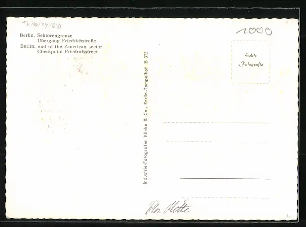Personenbezogene Daten auf der Rückseite der Karte wurden durch blauen Textmarker unkenntlich gemacht. Die blauen Stellen sind auf die Vorderseite durchgeweicht und wirken sich negativ auf das Postkartenfoto aus
