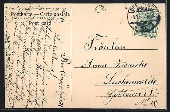alte Ansichtskarte, gelaufen 1911, Bugspur li. oben, guter Zustand