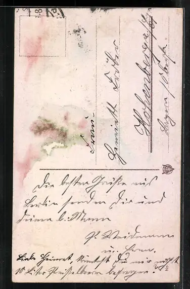 Personenbezogene Daten auf der Rückseite der Karte wurden durch blauen Textmarker unkenntlich gemacht. Die blauen Stellen sind auf die Vorderseite durchgeweicht und wirken sich negativ auf das Postkartenfoto aus