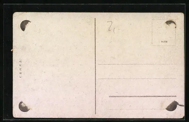 Personenbezogene Daten auf der Rückseite der Karte wurden durch blauen Textmarker unkenntlich gemacht. Die blauen Stellen sind auf die Vorderseite durchgeweicht und wirken sich negativ auf das Postkartenfoto aus