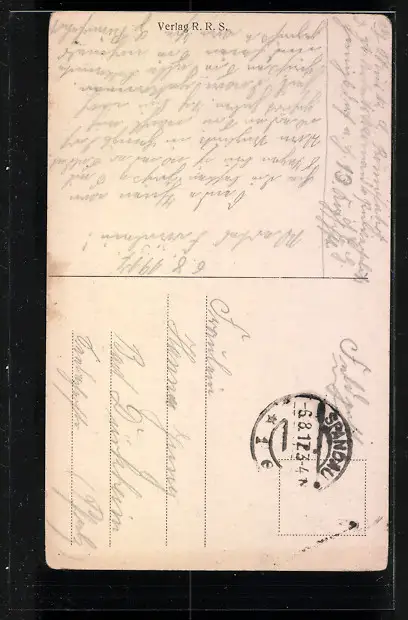 Personenbezogene Daten auf der Rückseite der Karte wurden durch blauen Textmarker unkenntlich gemacht. Die blauen Stellen sind auf die Vorderseite durchgeweicht und wirken sich negativ auf das Postkartenfoto aus