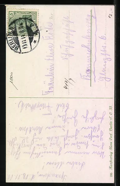 Personenbezogene Daten auf der Rückseite der Karte wurden durch blauen Textmarker unkenntlich gemacht. Die blauen Stellen sind auf die Vorderseite durchgeweicht und wirken sich negativ auf das Postkartenfoto aus