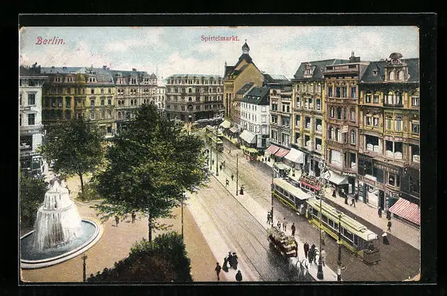 AK Berlin, Spittelmarkt mit Geschäften und Strassenbahn