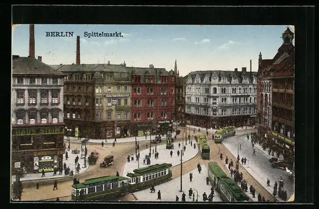 AK Berlin, Spittelmarkt mit Geschäften und Strassenbahnen