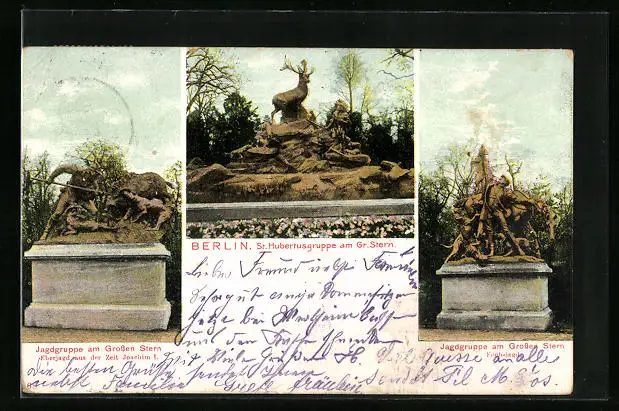 AK Berlin, St. Hubertusgruppe am Gr. Stern, Jagdgruppe am Grossen Stern, Fuchsjagd und Eberjagd aus der Zeit Joachim I.