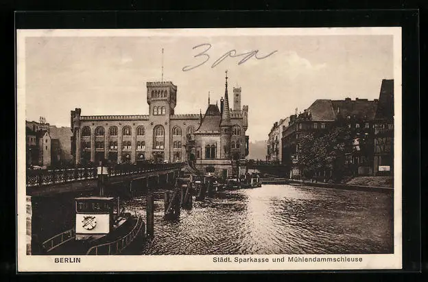AK Berlin, Städt. Sparkasse und Mühlendamm mit Schleuse