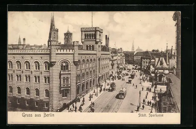 AK Berlin, Städtische Sparkasse am Mühlendamm mit Strassenbahn