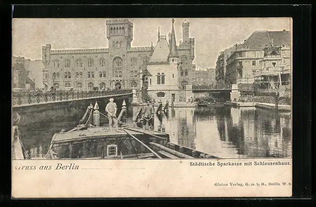 AK Berlin, Städtische Sparkasse mit Schleusenhaus, Weidendamm