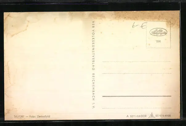 Personenbezogene Daten auf der Rückseite der Karte wurden durch blauen Textmarker unkenntlich gemacht. Die blauen Stellen sind auf die Vorderseite durchgeweicht und wirken sich negativ auf das Postkartenfoto aus