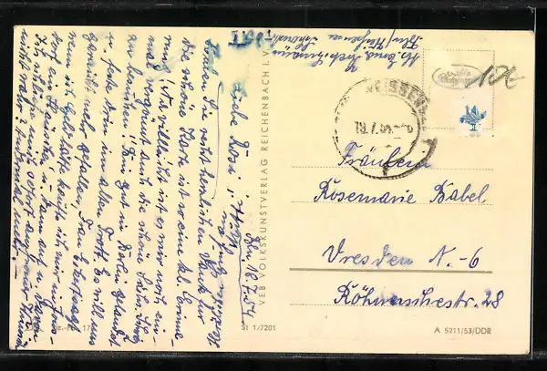 alte Ansichtskarte, gelaufen 1954, Briefmarke tw. entfernt, rückseitig Oberflächenschaden, guter Zustand