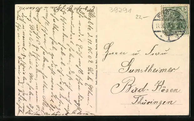 Personenbezogene Daten auf der Rückseite der Karte wurden durch blauen Textmarker unkenntlich gemacht. Die blauen Stellen sind auf die Vorderseite durchgeweicht und wirken sich negativ auf das Postkartenfoto aus