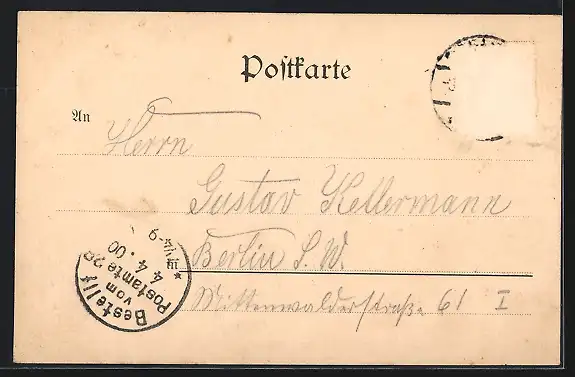 alte Ansichtskarte, gelaufen 1900, Briefmarke entfernt, rückseitig Oberflächenschaden, guter Zustand