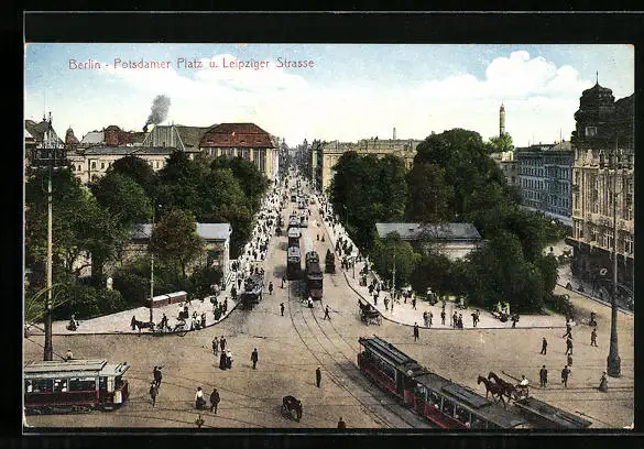 AK Berlin, Strassenbahn am Leipziger Platz u. Leipziger Strasse