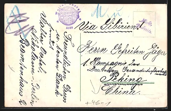 Personenbezogene Daten auf der Rückseite der Karte wurden durch blauen Textmarker unkenntlich gemacht. Die blauen Stellen sind auf die Vorderseite durchgeweicht und wirken sich negativ auf das Postkartenfoto aus