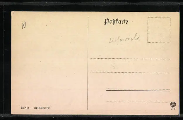 Personenbezogene Daten auf der Rückseite der Karte wurden durch blauen Textmarker unkenntlich gemacht. Die blauen Stellen sind auf die Vorderseite durchgeweicht und wirken sich negativ auf das Postkartenfoto aus