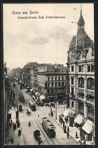 AK Berlin, Strassenbahnen in der Leipziger Strasse / Ecke Friedrichstrasse