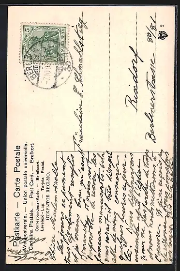 Personenbezogene Daten auf der Rückseite der Karte wurden durch blauen Textmarker unkenntlich gemacht. Die blauen Stellen sind auf die Vorderseite durchgeweicht und wirken sich negativ auf das Postkartenfoto aus