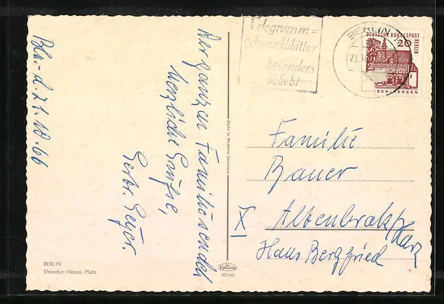 Personenbezogene Daten auf der Rückseite der Karte wurden durch blauen Textmarker unkenntlich gemacht. Die blauen Stellen sind auf die Vorderseite durchgeweicht und wirken sich negativ auf das Postkartenfoto aus