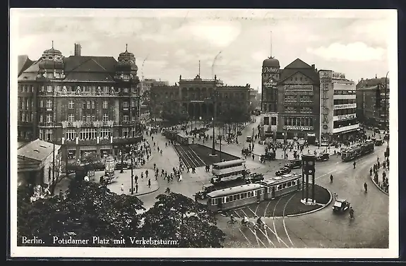 AK Berlin-Tiergarten, Blick auf den Potsdamer Platz mit Verkehrsturm, Strassenbahn