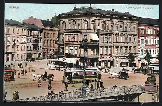 AK Berlin-Tiergarten, Potsdamer Brücke mit Geschäften und Strassenbahn