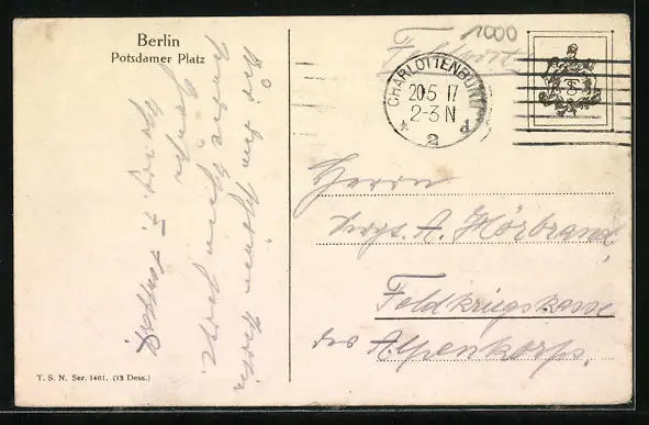 gelaufen 1917, Eckknicke unten, Stempelspur, guter Zustand
