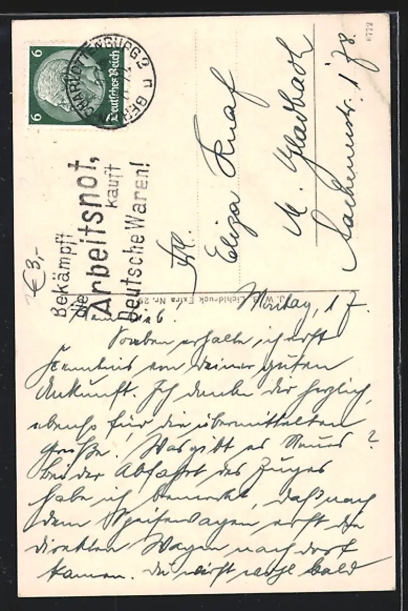 Personenbezogene Daten auf der Rückseite der Karte wurden durch blauen Textmarker unkenntlich gemacht. Die blauen Stellen sind auf die Vorderseite durchgeweicht und wirken sich negativ auf das Postkartenfoto aus