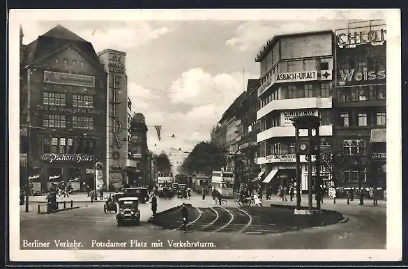 AK Berlin-Tiergarten, Potsdamer Platz mit Verkehrsturm, Pschorr-Haus