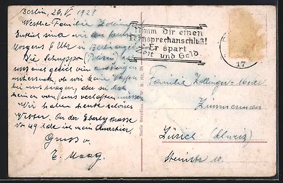 gelaufen 1928, Briefmarke entfernt, Eckknick oben re., guter Zustand