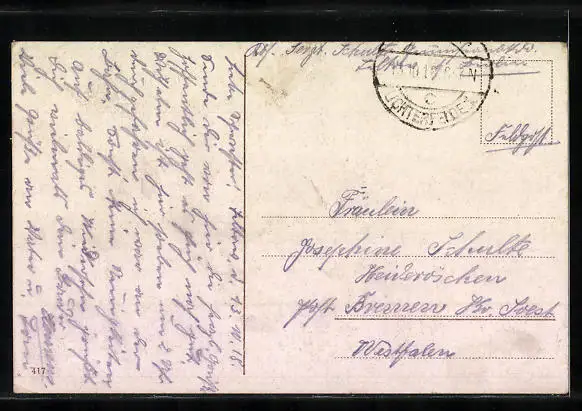 Personenbezogene Daten auf der Rückseite der Karte wurden durch blauen Textmarker unkenntlich gemacht. Die blauen Stellen sind auf die Vorderseite durchgeweicht und wirken sich negativ auf das Postkartenfoto aus