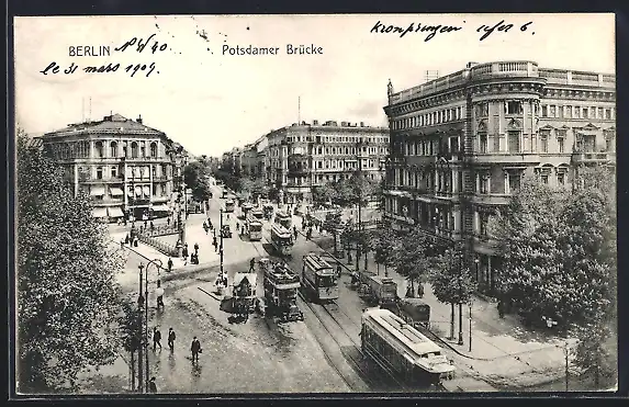 AK Berlin-Tiergarten, Viele Strassenbahnen an der Potsdamer Brücke