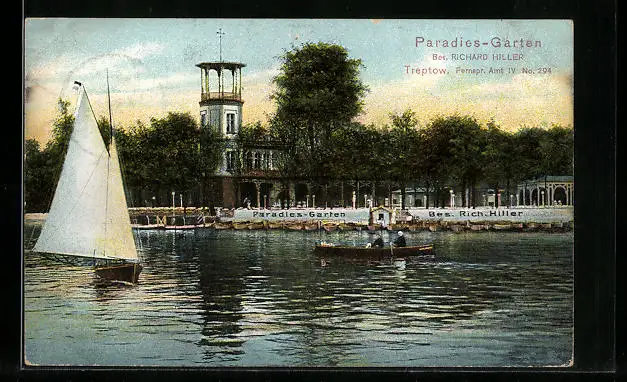 AK Berlin-Treptow, Gasthaus Paradies-Garten, Blick vom Wasser auf Boote und Ufer
