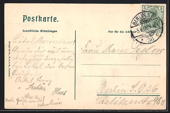 alte Ansichtskarte, gelaufen 1908, Eckknick unten li., guter Zustand